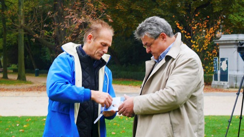 Practitioners do the exercises every week at The Parc du Cinquantenaire or Jubelpark. That morning, Andy Vermaut came to learn the exercises and did them for an hour and a half. At the end he suggested that everyone shout, “Falun Dafa is good!” He thinks that those who practice Falun Dafa have a peaceful mindset and that the principles of Truthfulness-Compassion-Forbearance can improve society’s moral standards.