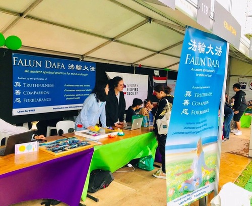 Sue Bishop was happy to see the Falun Dafa booth and chatted with the practitioners. She said, “I have been interested in Falun Dafa for a very long time. I know it is a very good practice that is persecuted in China. I also know that Falun Dafa practitioners are spreading the truth, and I hope that more people become aware of the Chinese Communist Party’s (CCP) true nature. I also know how the CCP harvests organs from practitioners while they are alive. This is unbelievable and unacceptable in Australia, but happens in China every day.”