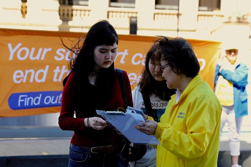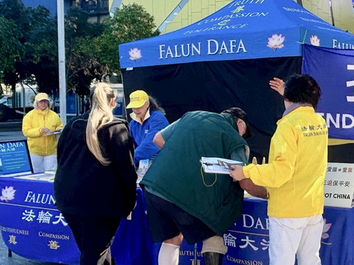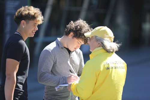 Many passersby saw the striking banners and practitioners doing the Falun Gong exercises, and stopped to learn more. Practitioners explained that the event was to celebrate 450 million Chinese people bravely choosing to withdraw from the CCP. After understanding what the rally was about, people expressed their support.