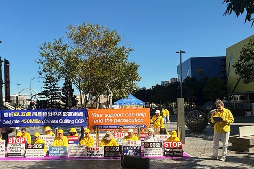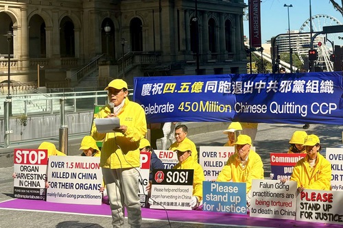 (Minghui.org) Falun Gong practitioners in Queensland, held a rally in Brisbane on August 16, 2025, to celebrate the 450 million brave Chinese men and women who have quit the Chinese Communist Party (CCP) and its affiliated organisations—the Youth League and the Young Pioneers.