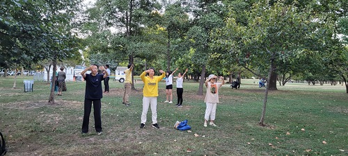 After viewing the exhibition, the students learned the five exercises of Falun Gong together.
