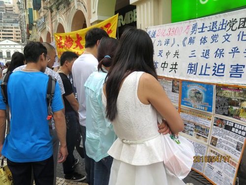 April 21, 2016 | On the eve of the 17th anniversary of the Peaceful Protest of April 25, Falun Gong practitioners from Macau held activities in front of St. Dominic’s Church, a popular tourist destination, on April 17.