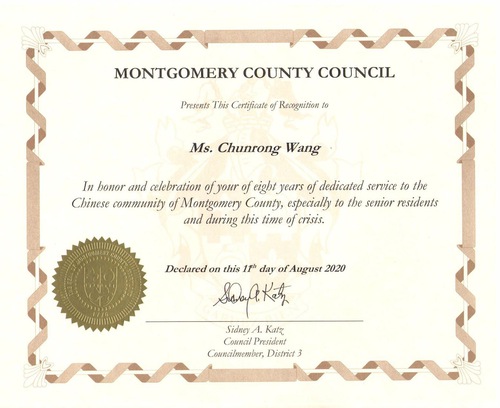 Ms. Wang Chunrong, a Falun Gong practitioner from China who now lives in the U.S, received an award from the Montgomery County Council in Maryland recently. The council thanked her for eight years of positive contribution to the Montgomery Chinese community, especially the care and help she gave to elderly residents during the coronavirus outbreak.