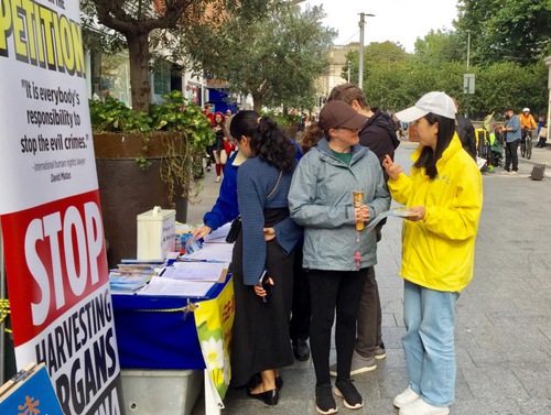 (Minghui.org) Falun Gong practitioners set up an information booth on Grafton street in downtown Dublin on September 23, 2023, to raise awareness of the ongoing persecution of their faith by the Chinese Communist regime. Tourists and local residents, including those from China, stopped to talk with practitioners on the busy shopping street.