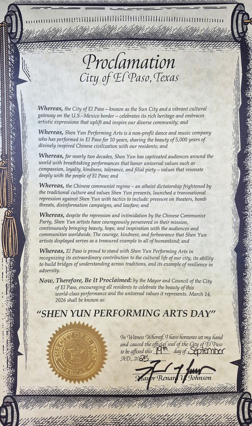“Now, Therefore, Be It Proclaimed: by the Mayor and Council of the City of EI Paso, encouraging all residents to celebrate the beauty of this world-class performance and the universal values it represents. March 14, 2026 shall be known as: “SHEN YUN PERFORMANCE ARTS DAY.””