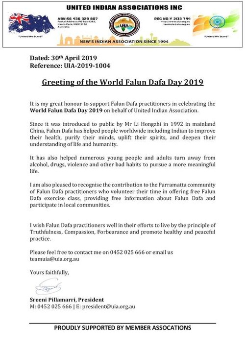 May 13 was declared “World Falun Dafa Day” in 2000. On the occasion of the 20th Falun Dafa Day and also the 68th birthday of Mr. Li, elected officials in Australia sent congratulatory letters to celebrate World Falun Dafa Day and commend Falun Dafa.