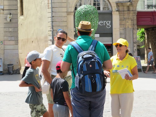 The information booth drew many locals and tourists, especially visitors from China. Many Chinese tourists were curious and took photos. One young Chinese man approached practitioners and asked detailed questions about Falun Gong overseas. He was surprised to learn that Falun Gong is freely practiced in many countries. He said, “You would never see something like this in China.” Before leaving, he asked for informational materials. Seeing this, other Chinese tourists who had hesitated before also started taking flyers.