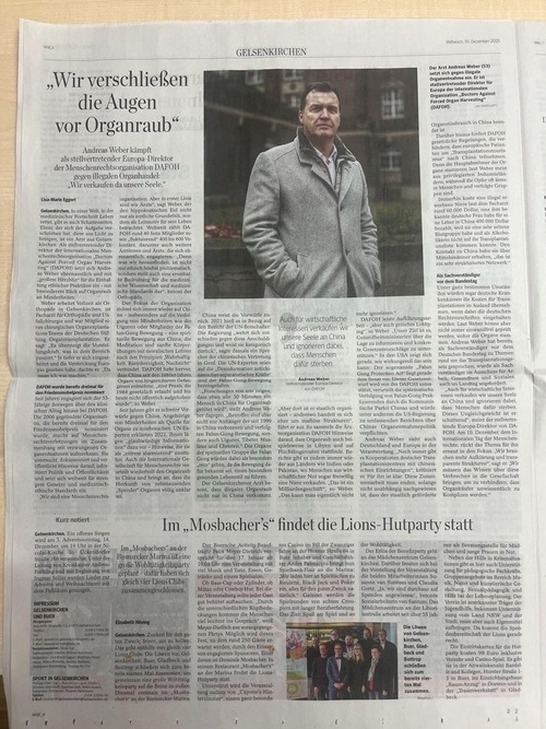 (Minghui.org) The local edition of the Westdeutsche Allgemeine Zeitung (WAZ) newspaper in Gelsenkirchen carried a report titled “We are turning a blind eye to organ harvesting” on December 10, 2025, Human Rights Day. It calls on Germany to pay attention to the Chinese Communist Party’s (CCP) state-sanctioned forced organ harvesting.