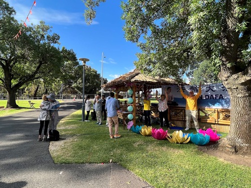 (Minghui.org) Falun Dafa practitioners participated in the HOTA Hawker Twilight Market on July 12, 2025 in Queensland’s famous Gold Coast. Their booth drew many visitors. They demonstrated the Falun Dafa (also known as Falun Gong) exercises and introduced the spiritual practice to the public.
