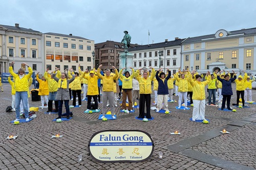 (Minghui.org) Falun Dafa (Falun Gong) practitioners held a candlelight vigil and practiced the exercises together at Gustaf Adolfs Torg in Gothenburg, Sweden, on September 19, 2025.