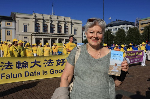 Ida was excited to learn that Falun Dafa was introduced to Europe 30 years ago and is now practiced in over 100 countries. She asked where she could learn the practice and was happy to know she could find information free of charge on the Internet. She was thankful for the information and said she looked forward to joining local practitioners.