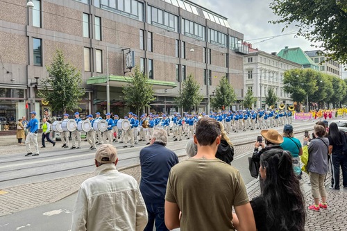 Many people stopped along Kungsportsavenyen to watch the parade, and take pictures of the Tian Guo Marching Band and bright banners emblazoned with “Truthfulness-Compassion-Forbearance.” As practitioners demonstrated the Falun Dafa exercises, people wanted to know more about the festive occasion.