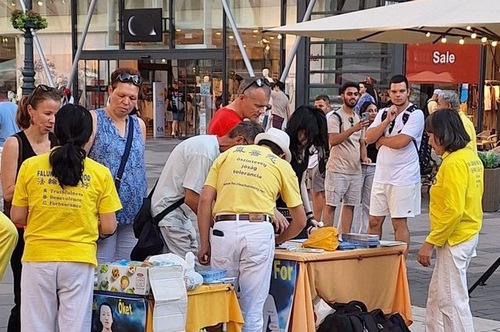 (Minghui.org) Practitioners in Hungary held a rally on Vörösmarty Square in Budapest’s city centre on Saturday, July 19, 2025, to peacefully protest the Chinese Communist Party’s (CCP) 26-year-long persecution of Falun Gong.