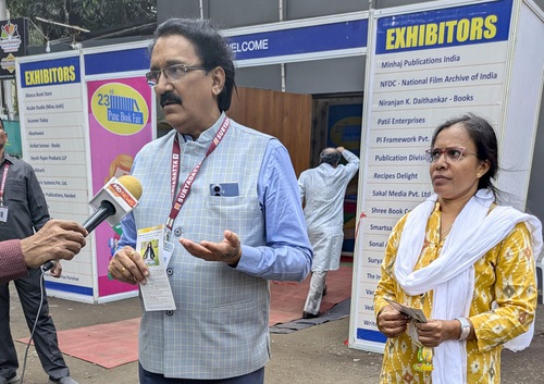 During the book fair inauguration, practitioners had the opportunity to introduce Falun Dafa to the chief guest of the fair, Vishwas Patil. Mr. Patil is a renowned Marathi author and former Indian Administrative Service (IAS) officer. Practitioners briefly explained Falun Dafa to him and provided him with printed information.