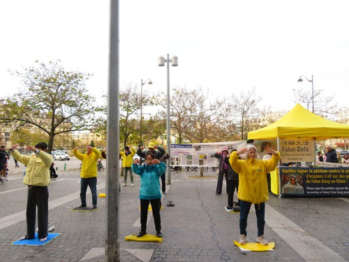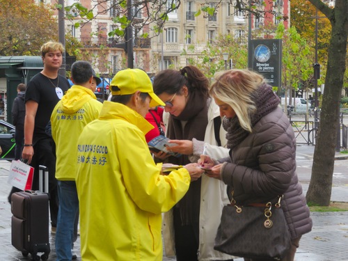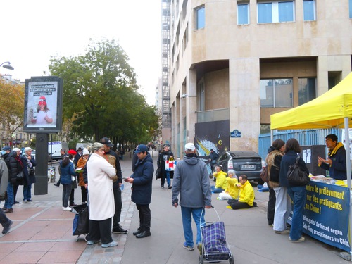 November 11 is a public holiday in France. Falun Dafa practitioners gathered in Belleville, demonstrated the exercises, and talked with passersby about the spiritual practice and the CCP’s persecution. Many people signed a petition calling to stop the persecution. Several Chinese people renounced their membership in the CCP and its affiliated youth organisations during the event.