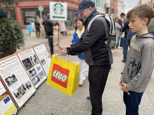 Lisa and Joe from London were visiting Ireland for the weekend. They said that they always see practitioners peacefully protesting outside the Chinese Consulate in London. They were surprised to see Falun Dafa practitioners holding an event in Ireland. They said that what practitioners do is very important, “Not only do you tell the world what practitioners in China suffer, but you also let people in Europe understand the danger they are facing now: the CCP is infiltrating every stratum of society. If the CCP can indeed break the principles of Truthfulness-Compassion-Forbearance by spending such a huge amount of resources and time, then no one will be able to escape its devil’s claws.”