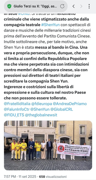 In his statement on social media issued on September 11, 2025, Senator Giulio Terzi wrote, “The practice of the spiritual discipline of Falun Gong has been banned in China since 1999. This is a battle of civilisation and human dignity, reaffirming the inviolability and universality of fundamental human rights, while denouncing the odious practice of forced organ harvesting from Falun Gong practitioners held in China’s horrific prisons.