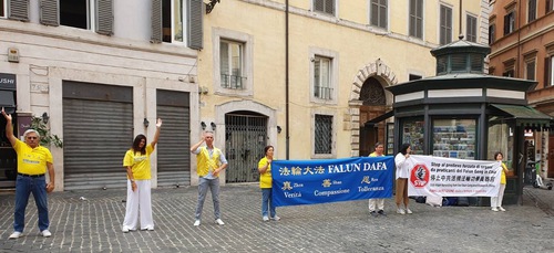 The practitioners displayed a banner at Piazza Capranica that read “Stop Organ Harvesting from Living Falun Gong Practitioners in China,” which caught many people’s attention.
