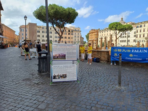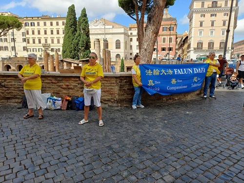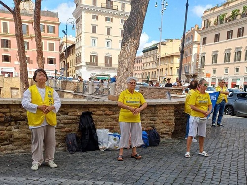 Practitioners demonstrated the exercises and distributed fliers at Largo di Torre Argentina in central Rome on July 26, 2025. The event caught the attention of many passersby, who stopped to learn about the situation and expressed their support and concern. Some signed the petition.