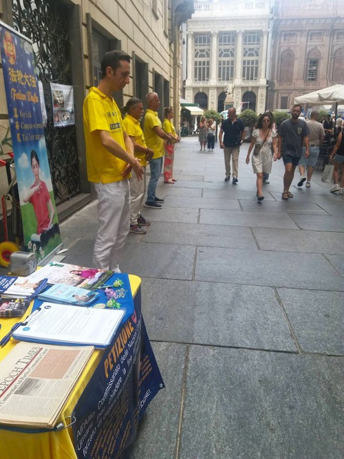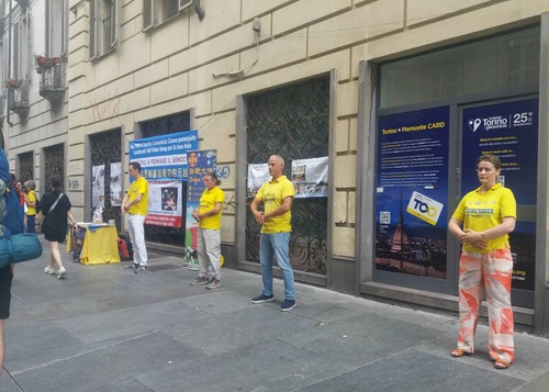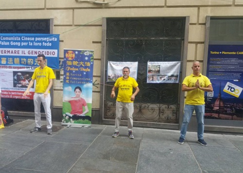 Practitioners demonstrated the Falun Dafa exercises in the centre of Torino and distributed truth-clarifying materials on Sunday, July 20. The event attracted many residents and tourists, and some asked for more information.