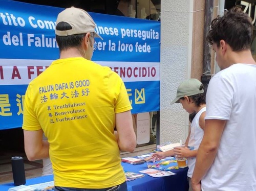 (Minghui.org) Practitioners in Italy held events in several cities from July 19 to 26, 2025, to tell people how the Chinese Communist Party (CCP) persecutes Falun Dafa. They called on all sectors of society to join them in their efforts to end the CCP’s brutal persecution that has gone on for 26 years. People expressed their support for the practitioners’ peaceful efforts to expose the persecution.