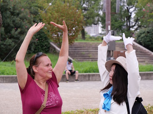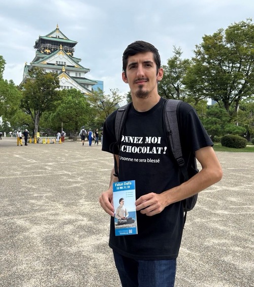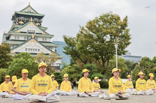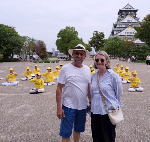 Before the march, Falun Dafa practitioners divided into small groups to do the exercises at various tourist attractions. When Ron from Australia saw the group exercise at Osaka Castle Park, he asked for more information and said he agreed with the principles of Truthfulness-Compassion-Forbearance.