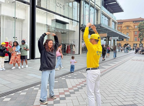 A passer-by learns the Falun Dafa exercises.