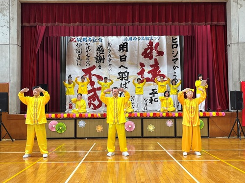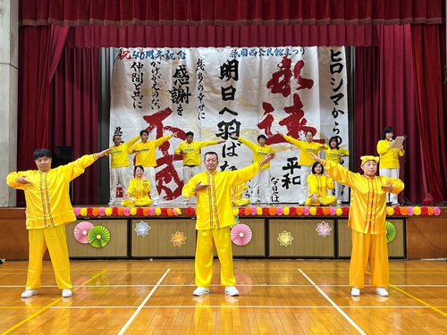 (Minghui.org) Falun Dafa practitioners participated in the Gionnishi Community Centre celebration in Hiroshima, Japan, on November 9, 2025. The event marked the community centre’s 40th anniversary. Besides stage performances, there were special food stalls, handicrafts, and various goods where many residents attended.