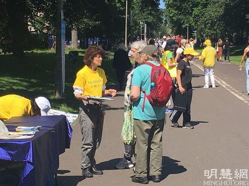 Practitioners performed the song Falun Dafa is good on the waist drums. Afterward, they demonstrated the five exercises, while one practitioner explained the principles and benefits of practicing. Many people in the audience followed the practitioners’ movements when they demonstrated the exercises.