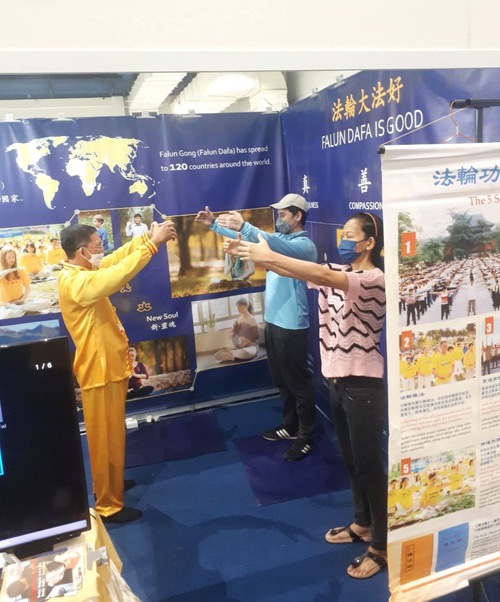 A mother of two saw the instructional videos of Falun Dafa and said to her son and daughter, “Aren’t both of you interested in qigong practice? This is it here.” The lady and her two children learned to practice Falun Dafa exercises for almost an hour at the booth.