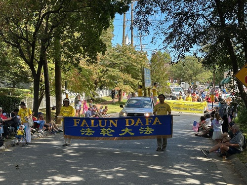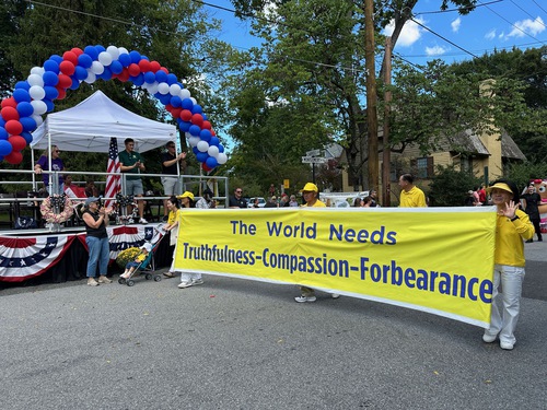 (Minghui.org) Falun Dafa practitioners from the Greater Washington, DC area participated in the Labor Day parade and celebrations in Kensington, Maryland on September 1, 2025. Many residents thanked them for bringing the message, “The World Needs Truthfulness, Compassion and Forbearance.”