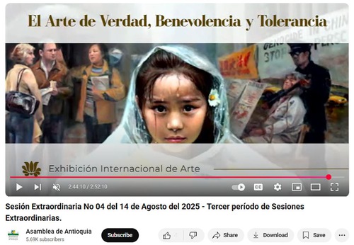 (Minghui.org) Falun Dafa practitioners in Medellín, Colombia, held two Art of Zhen, Shan, Ren (Truthfulness, Compassion, Forbearance) exhibitions in August 2025. The first exhibition was held at the Medellín City Council from July 28 to August 15. The second exhibition was held August 18 to 29 at the headquarters of the Assembly of Antioquia.