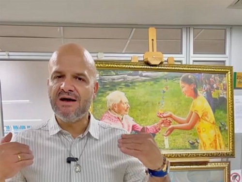 “Some of [the paintings] really catch my attention. This one, as I mentioned to you, where we see a homeless [practitioner] on the street and we see that there is an archangel protecting them […] and playing for them with her violin, giving a message of hope and giving them peace in the midst of adversity,” he said. “I really like it and I congratulate you on these works of art.”