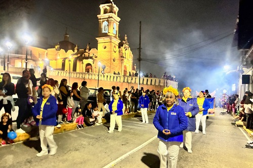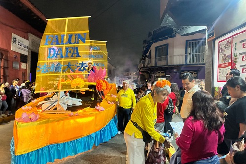 (Minghui.org) Falun Dafa practitioners participated in the Catrinas Parade in Xalapa, the capital of Veracruz state, on October 25, 2025. They conveyed Falun Dafa’s principles of Truthfulness, Compassion, and Forbearance. A total of 48 groups took part in this parade.