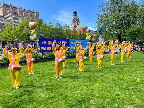 Leading the group was the Waist Drum Team, which was warmly received by spectators who cheered and applauded as they marched to the rhythm of “Falun Dafa Is Good.” Many people said they also admired practitioners’ Falun Dafa exercise demonstration.