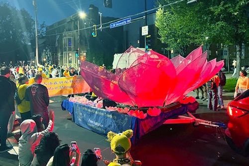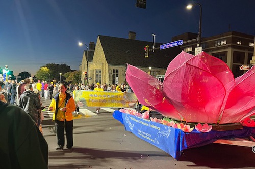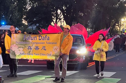 The parade started at 6:30 p.m., the Falun Gong Twin Cities Club members’ float was decorated with a large pink lotus flower and practitioners dressed in traditional Chinese costumes waved to spectators. Practitioners carried banners in front of, and behind the float, and practitioners distributed lotus flowers along the parade route.