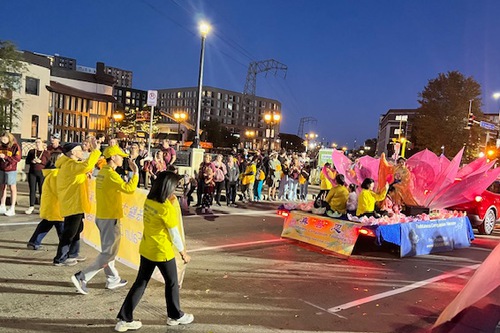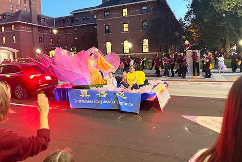 (Minghui.org) The Falun Gong Twin Cities Club participated in the University of Minnesota Homecoming Parade on October 10, 2025. Many spectators said they were impressed by the brightly coloured float, costumes, and uplifting music.