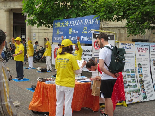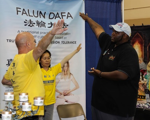 When a student saw the Falun Dafa (Falun Gong is also known as Falun Dafa) banner, he and his friend chatted with practitioners. This student previously heard about the persecution in mainland China by the Chinese Communist Party (CCP), and told his friend about the religious suppression there, and said that Falun Gong is popular in Taiwan and other countries.