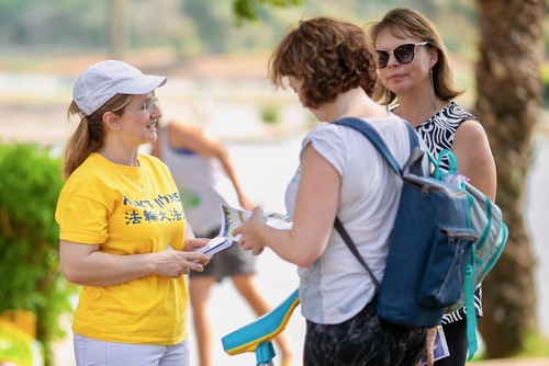 Practitioners performed waist-drum and lotus flower dances and demonstrated the exercises. As the only participating Asian group, their colorful costumes and lively drum music presented the beauty of traditional Chinese culture. Spectators clapped, waved American flags, and greeted practitioners. Many were handed Falun Dafa introductory flyers and immediately looked up the information online.