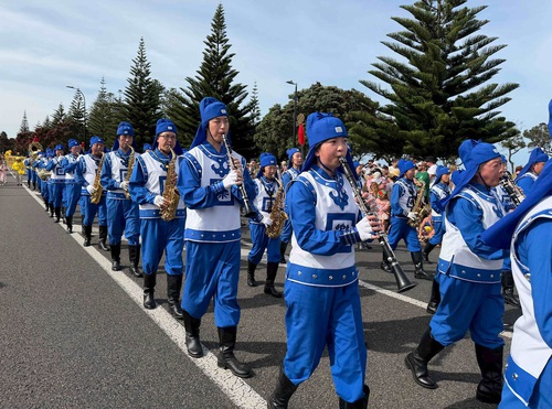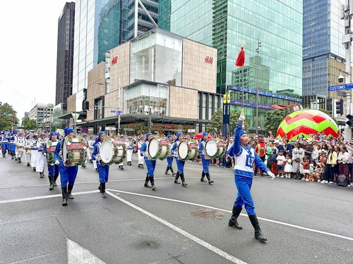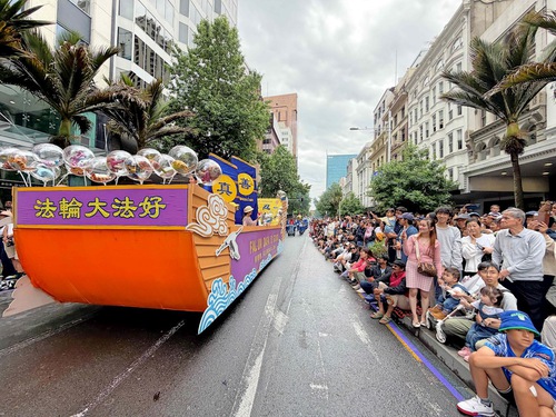 The Tian Guo Marching Band composed of Falun Dafa practitioners from New Zealand and Australia were greeted with warm applause. People took photos, complimented the band on their blue and white outfits, and said the band’s music blended perfectly with the event’s festive atmosphere. Eye-catching “Truthfulness-Compassion-Forbearance” banners decorated the float, which was followed by the dragon dance team, something the children really enjoyed.
