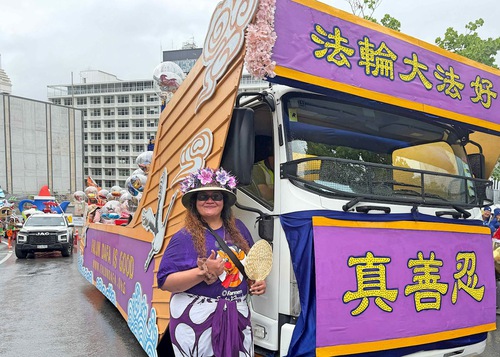 When she saw the float with the “Truthfulness, Compassion, Forbearance” banners, she said, “I really like that. Those are positive values.”