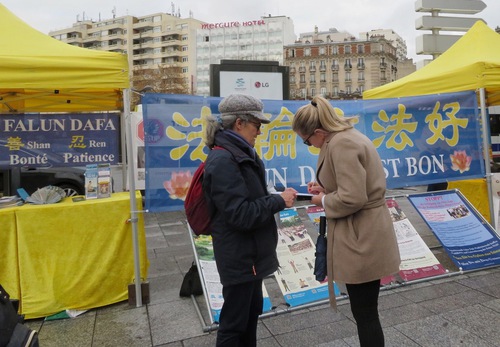 Roselyne Segaler, a freelance writer, signed the petition and said, “I’m shocked that Chinese people are completely deprived of their human rights.” She said she watched a documentary about Falun Dafa on French Television Station of Arts. The film showed how the Chinese Communist regime created false stories to slander Falun Dafa, and how practitioners hijacked the television signal and broadcast the facts. She was shocked by the torture practitioners were subjected to in prison, where they were forced to work for more than 12 hours every day.