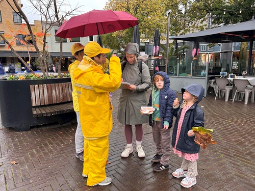 Practitioners set up displays and demonstrated the Falun Dafa exercises on Heuvel Street in Oss, a city in North Brabant Province, on October 25, 2025. Despite the rain, many people stopped to talk with practitioners and learned about Falun Dafa.