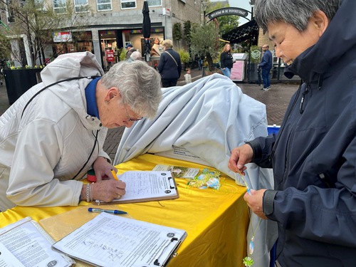 A Chinese man stopped his bike at the booth and told a practitioner, “Your practice is great!” The practitioner told him about Falun Dafa and quitting the Chinese Communist organisations. The man said, “The Communist Party has deceived many people. I know Chinese people are living a hard life.” He thanked practitioners for their hard work despite the bad weather. “It’s great that you hold events to tell people about the situation in China,” he said.