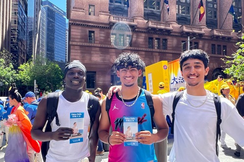 Tavian Lima, a year 12 student, said, “When I was coming out of the train station, I saw a lot of people, so I wanted to figure out what was going on, and the yellow stands out. It didn’t look like a protest—it was really peaceful. I learned that people don’t have freedom of speech, and that this [parade] is very good, and it is going to open up a lot of pathways, and it is going to be very peaceful for people. I think the principles [Truthfulness, Compassion, and Forbearance] are good. I think truthfulness is a big principle that everyone needs to learn. I think everyone should be nice to each other.”