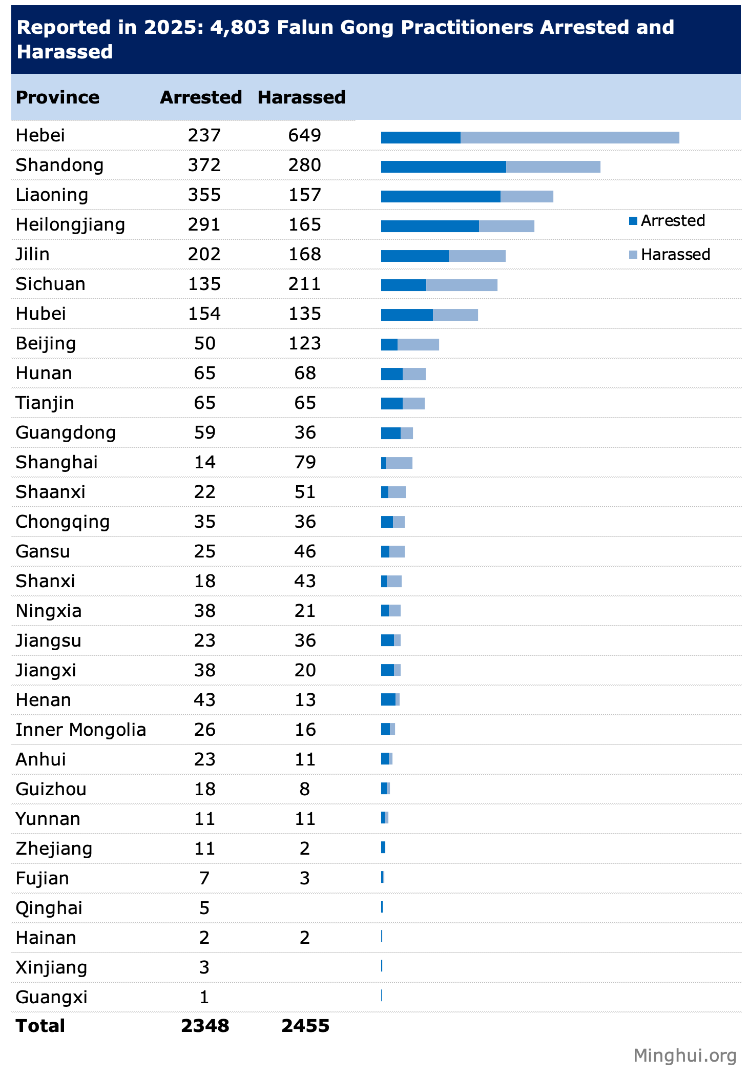 In particular, Hebei, a province encircling Beijing, reported the most cases, totalling 886 (arrests and harassment combined). The persecution in Shandong and Liaoning was also severe, with 652 and 512 cases reported, respectively. Seven other regions also registered three-digit numbers of cases, between 130 and 456. A total of sixteen regions had double-digit totals, ranging from 10 to 95. The remaining four regions registered cases in the single digits, between 1 and 5.