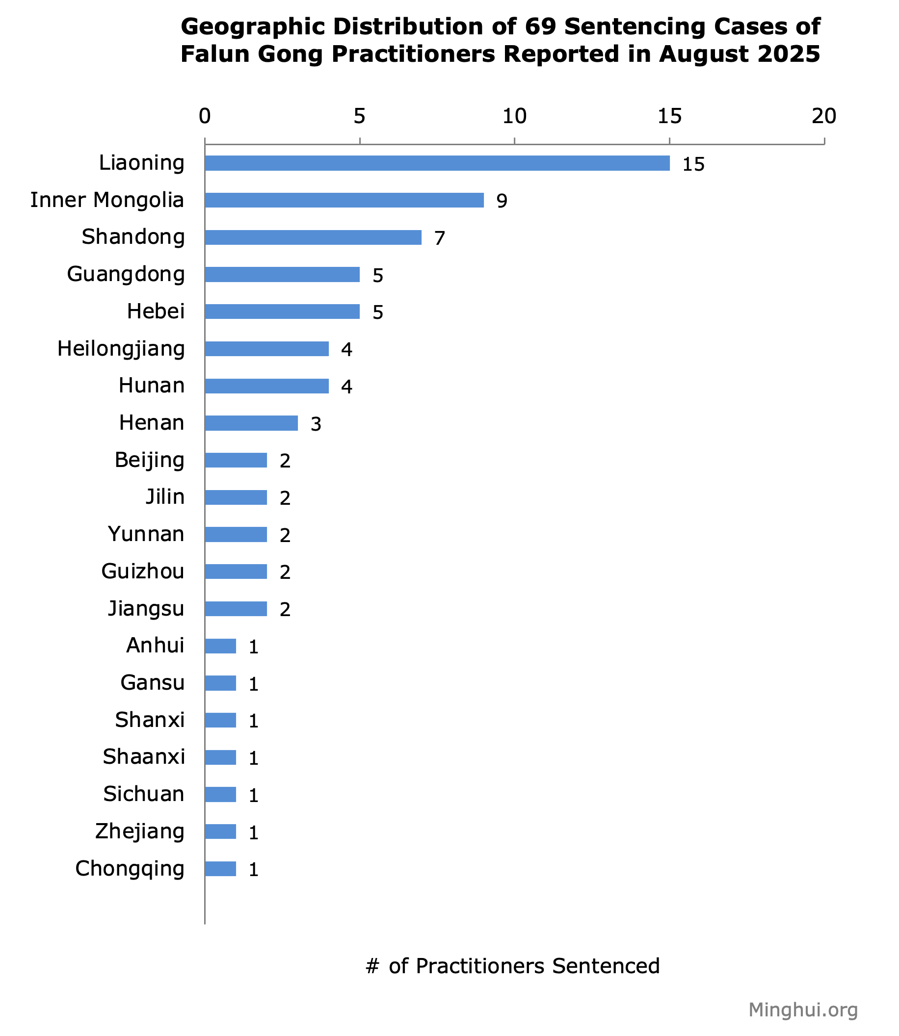 The sentenced Falun Gong practitioners are from twenty provinces or centrally-controlled municipalities. Liaoning reported the most cases, 15, followed by 9 cases in Inner Mongolia and 7 cases in Shandong. The remaining seventeen regions had between 1 and 5 cases.