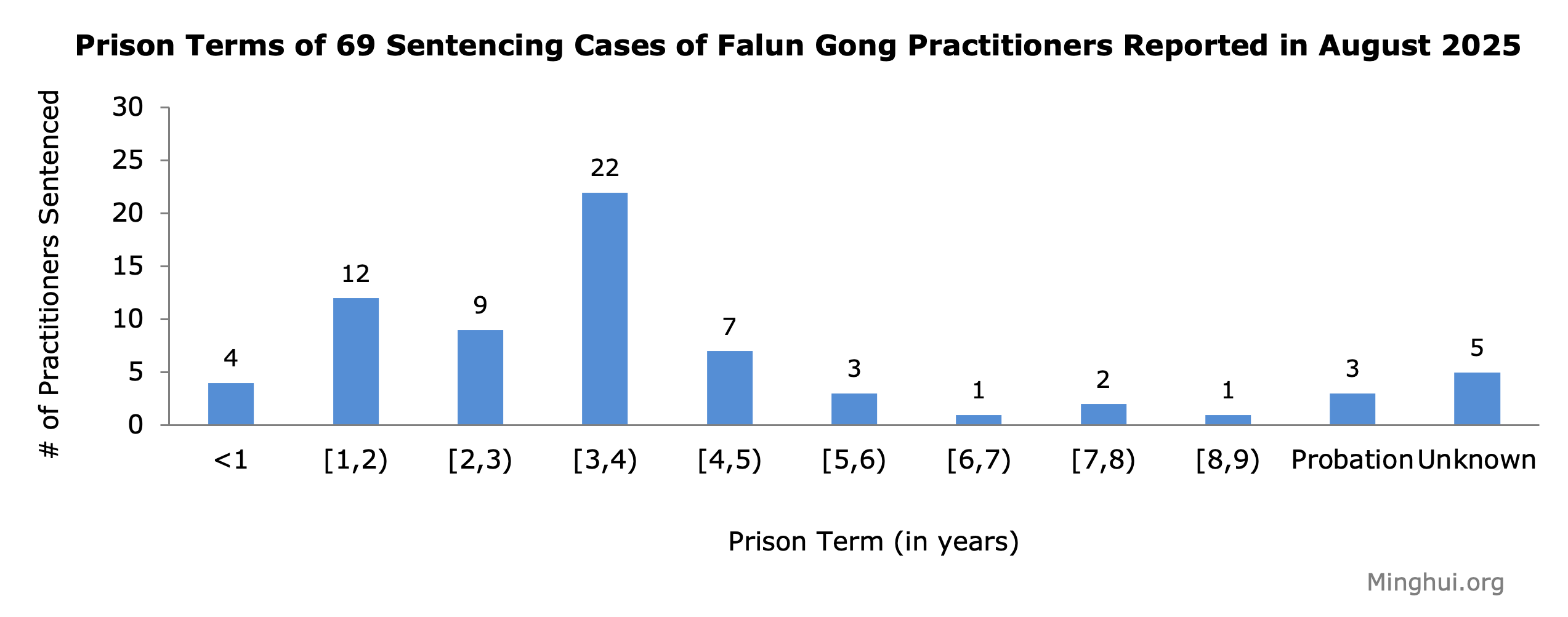 (Minghui.org) Another 69 cases of Falun Gong practitioners sentenced to prison for their faith were reported in August 2025.