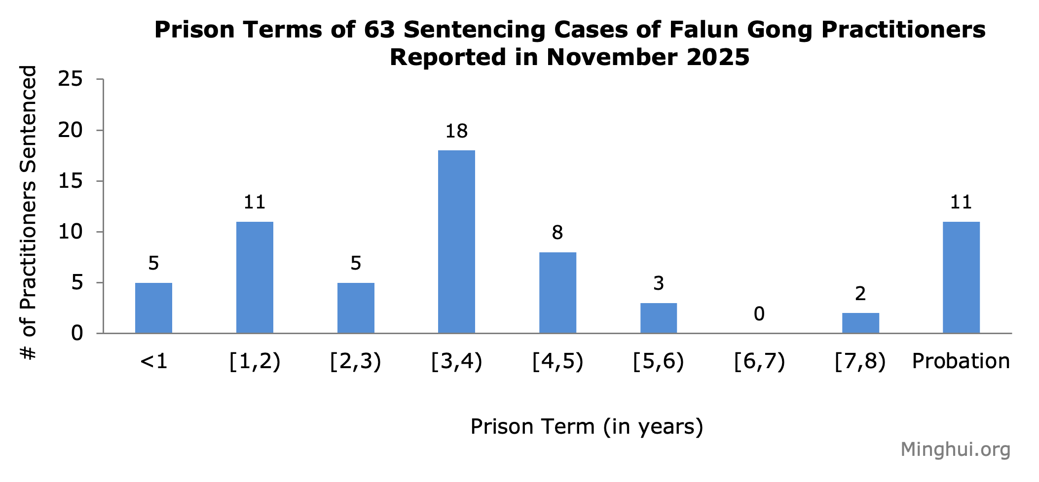 (Minghui.org) A total of 63 cases of Falun Gong practitioners sentenced to prison for their faith were reported in November 2025, including 57 cases that took place in 2025 and 6 in earlier years. The delay in reporting is due to the information censorship in China under the communist regime, which made it difficult for Minghui correspondents to collect, verify, and report the data in a timely manner.