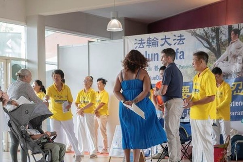 Many people asked about Falun Dafa and why Chinese practitioners are persecuted by the CCP. The practitioners thoroughly answered their questions, and introduced the principles of Falun Dafa. They also shared their personal experiences and how their physical health, mental health, and moral character improved after they began practicing.